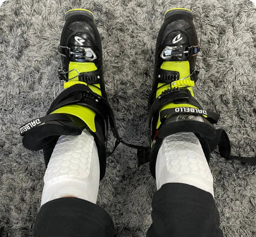 - Vérifie que le protège-tibia soit bien en contact avec la languette de ta chaussure de ski.